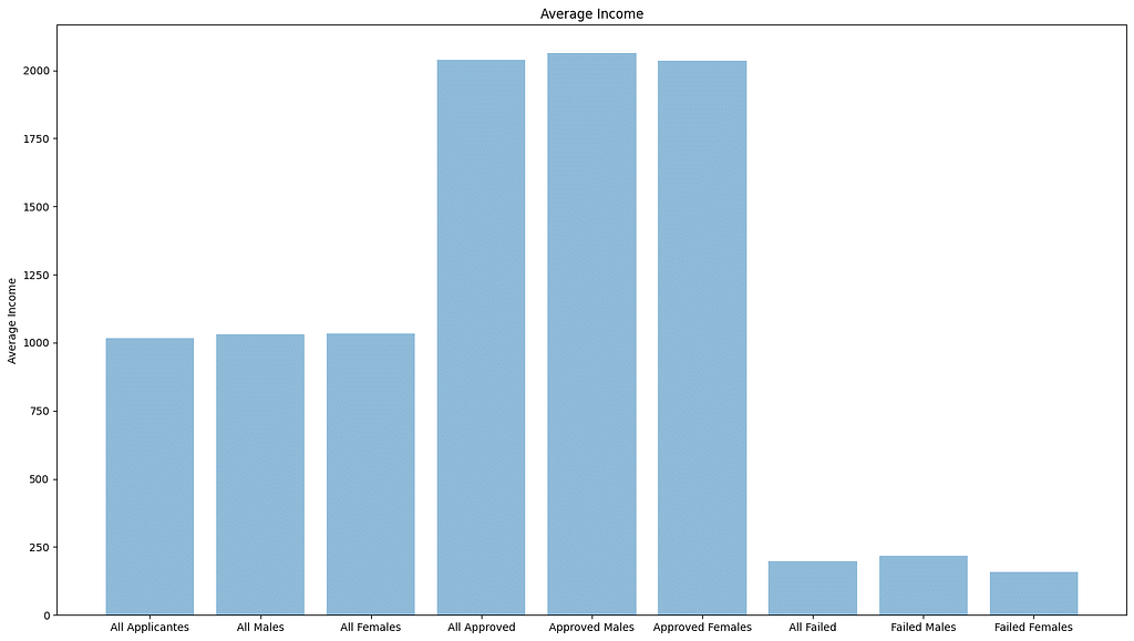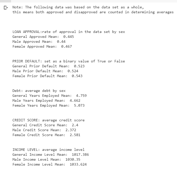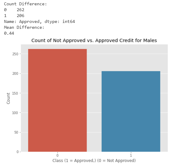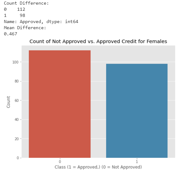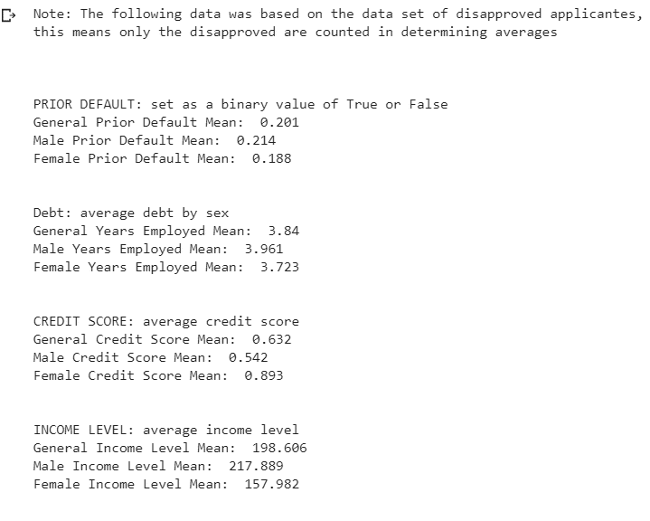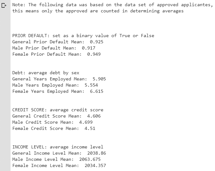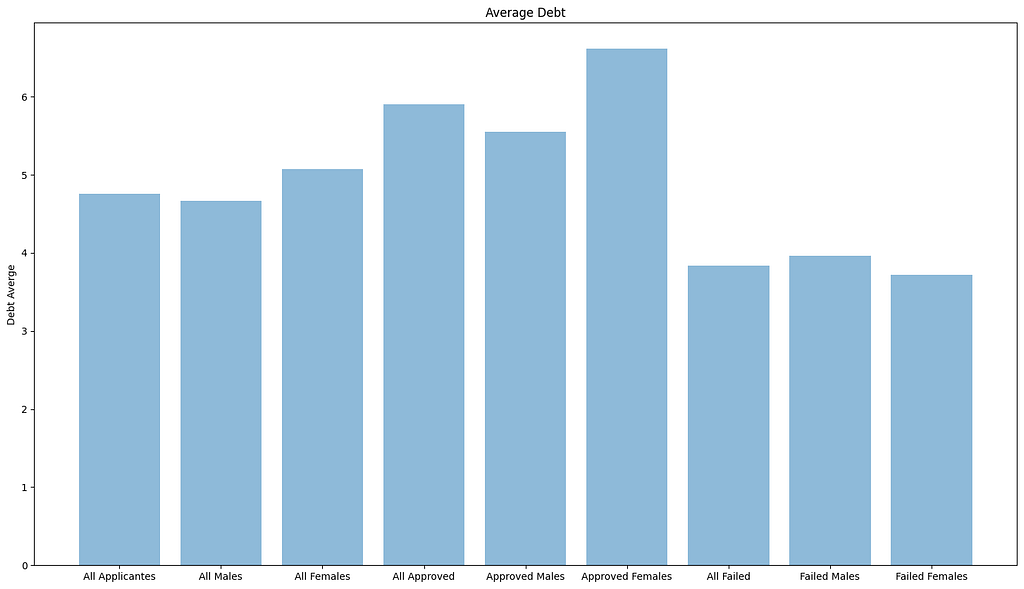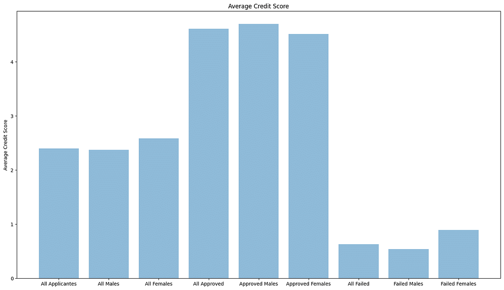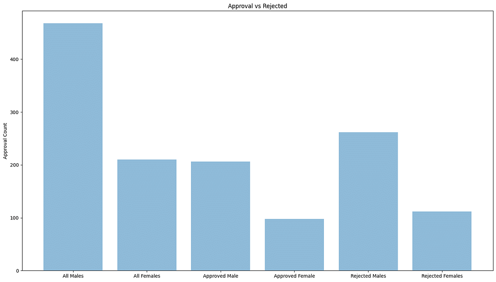 Looking at the data as a whole seems that the causalities are prior default, debt, credit score and income. The men and women that got approved score relatively similar in average to each other, as do the men and women who got rejected. Having had more men approved is simply a matter of having had more men who qualified with these mentioned factors applied and there isn’t a bias in the approval process.