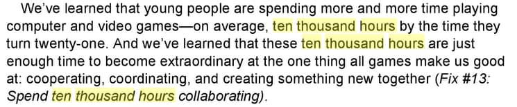 The book Reality is Broken I mentioned earlier has the following to say about the ten thousand hour rule:
